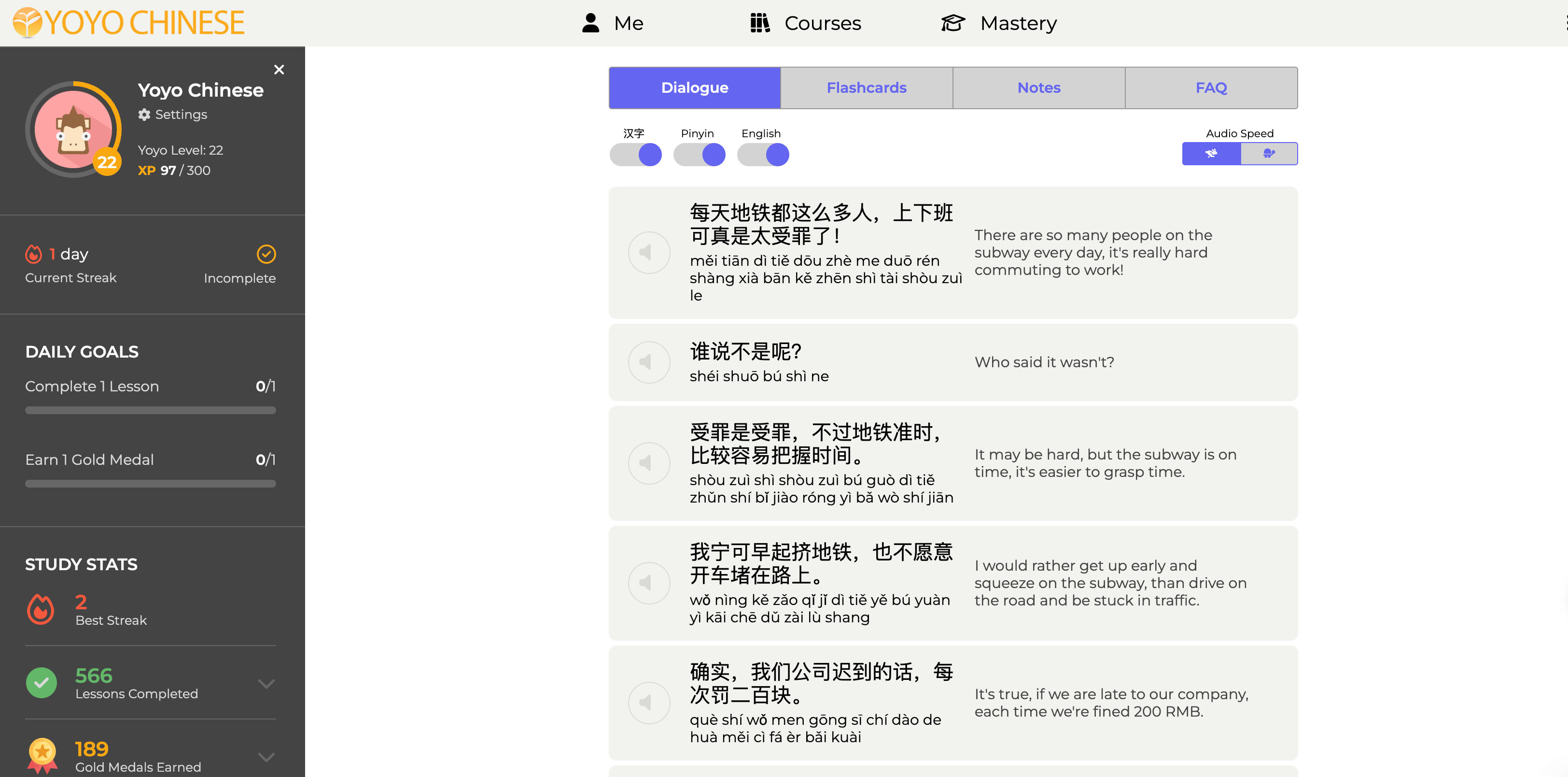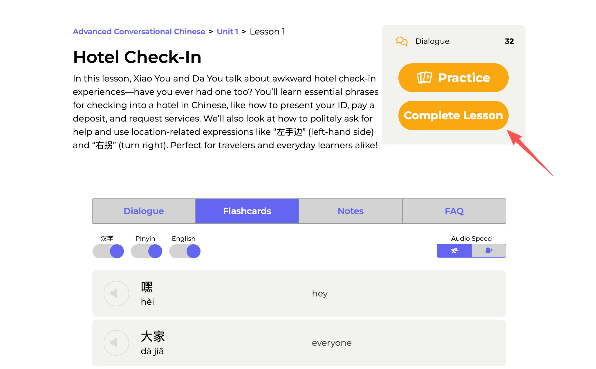 In the first lesson of each unit, you will find dialogue replay, flashcards, notes, and eventually FAQ support. Dialogue replay is especially important, as it breaks the conversation into manageable pieces and allows you to listen, repeat, and internalize the language. It is one of the most effective ways to turn passive understanding into active ability.
