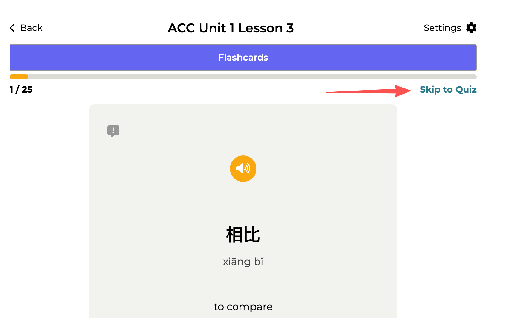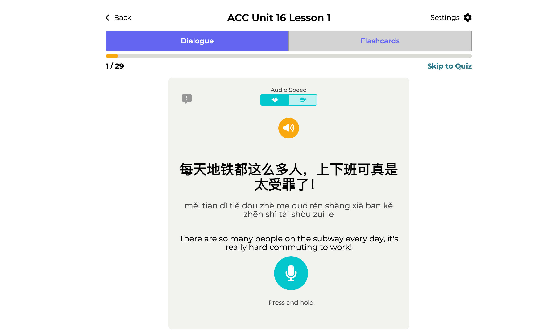 Second, when you click the “Practice” button and enter the Dialogue and/or Flashcards pages, you may notice a “Skip to Quiz” button in the upper right corner. For now, if you click that button, the page will temporarily jump back to the current lesson’s video page instead of taking you to a quiz page. This is also temporary behavior. Once the quiz feature is fully available, this function will return to normal.